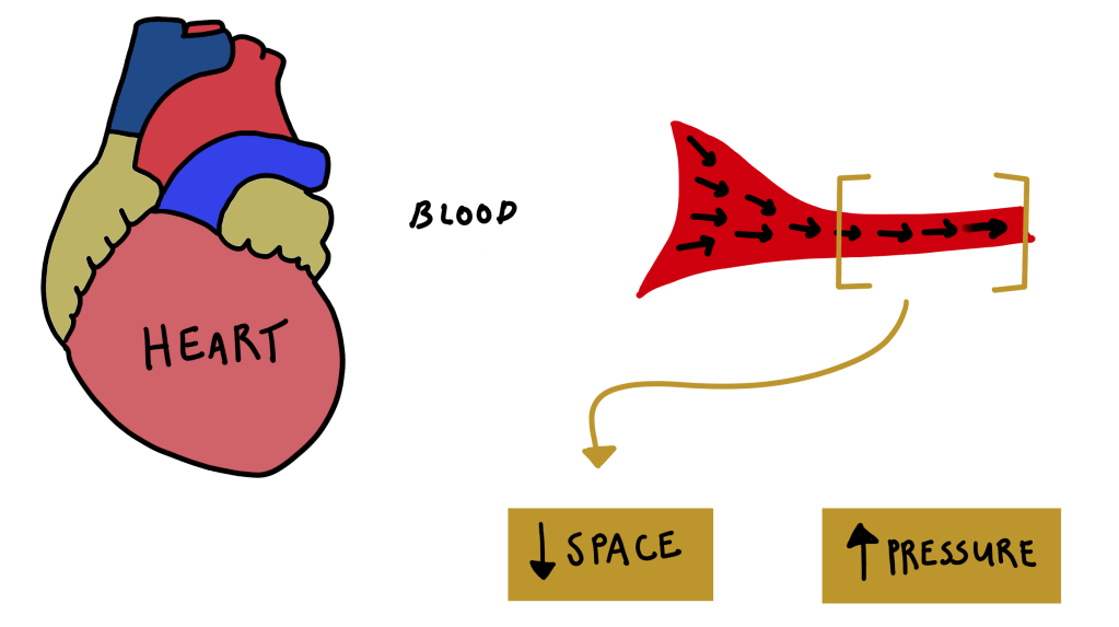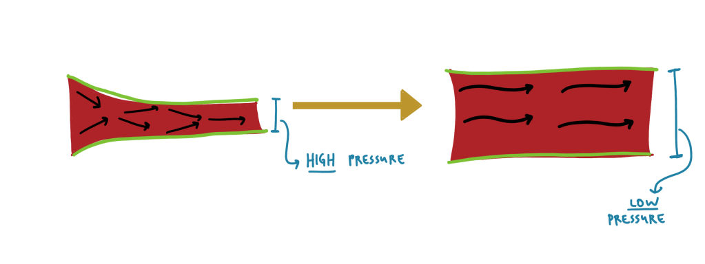There is a process called Vasodilation. Vasodilation is the relaxation of arteries. This means that the arteries actually widen to increase the blood flow to your body. Imagine a water hose – if you put your thumb over the end of it with the water running, the area for the water to exit is smaller and the pressure of the water coming out is higher. When you release your thumb, the water pressure decreases. Similarly, when the arteries widen, the blood pressure decreases. Remember that!